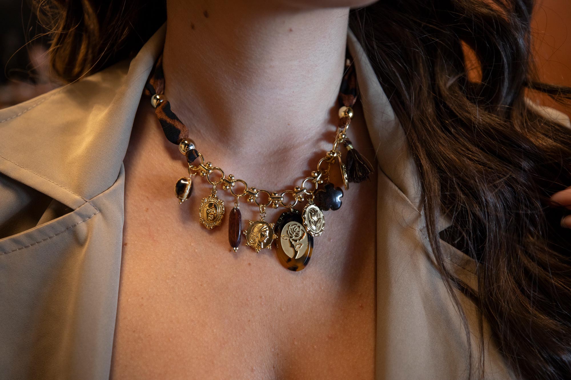 Collier tissu léopard et charms en acier inoxydable
